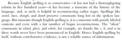Происходило это всё довольно непоследовательно. Так, receit «квитанция» переделали в receipt /рисиит/, поскольку оно восходит к латинскому receptus. Но однокоренные deceit /дисиит/ «обман» и conceit /кəнсиит/ «самомнение» сохранили старый вид, и написания deceipt и conceipt не смогли закрепиться. Fantom преобразовали в phantom /фæнтəм/ в связи с его этимологией (от греческого φάντασμα «призрак»), а вот fancy /фæнси/ «иллюзия, фантазия» от того же корня (греч. φαντασία «представление, видение») удержало старое написание, хотя и были попытки писать phancy.