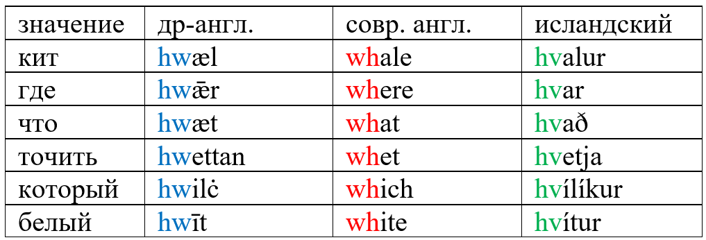 2. В слове hwā > hwō > who «кто» звук w исчез по фонетическим причинам, так же, как в two «два» и sword «меч».