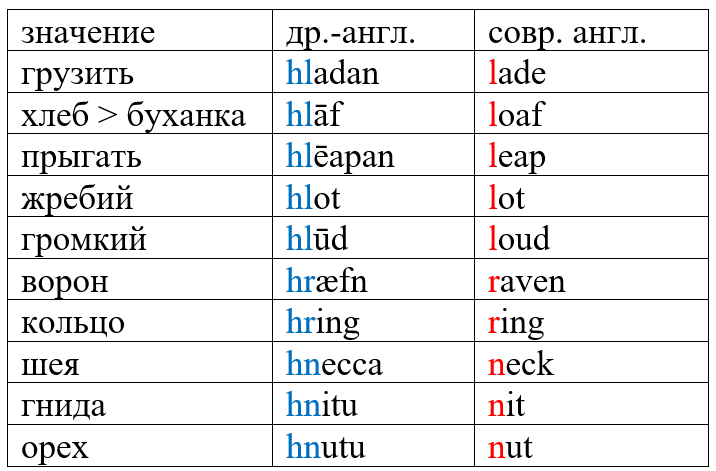 Как я уже рассказывал в одном из предыдущих постов, в древнеанглийском в начале слова могли быть сочетания hl-, hr-, hn-, однако в XI веке h в них начинает исчезать (макрон над гласным обозначает его долготу):