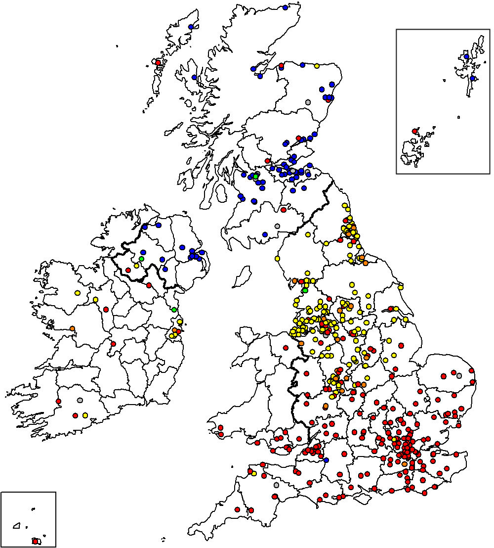 Жёлтыми точками отмечены места, где gut и foot рифмуются (то есть, гут и фут), а красными – где нет (гат и фут):