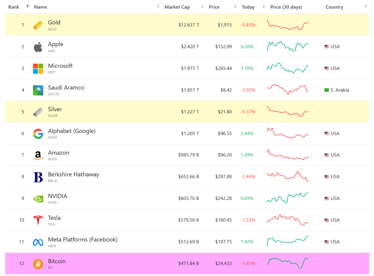 Конечно, биткойн не создает беспилотные автомобили, смартфоны или электронную продукцию, и ему будет трудно обогнать компании, которые занимаются этим, например: Tesla, Apple и т.д.. Но знаете, что схоже с BTC? Золото, оно по-прежнему №1, с большим отрывом. Оно существует уже много веков. Люди доверяют ему и верят в его ценность.