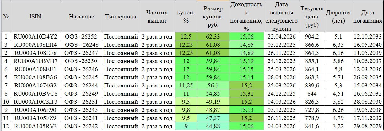 Сейчас длинные выпуски ОФЗ дают купоны 9–12,5% и доходность к погашению до 15% годовых.