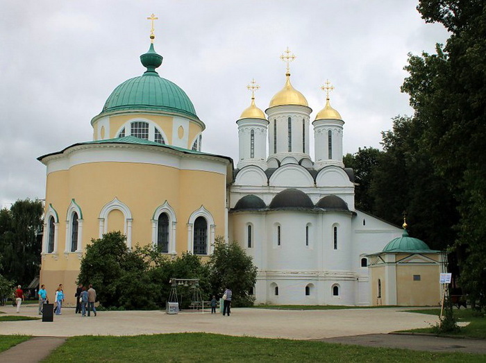 Собор Спаса Преображения - белая, справа (1505-1516) и церковь Ярославских Чудотворцев (1827-1831). В более старом храме уровень пола первого этажа на полметра ниже современного уровня земли. В "новой" церкви - высота крыльца и вход на высоте примерно полтора метра от земли.