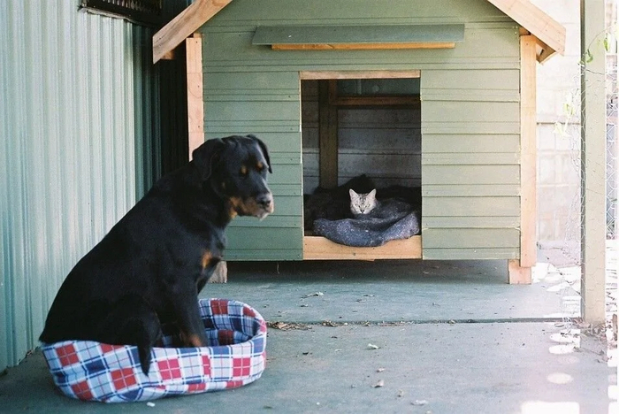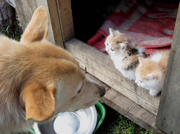 Кошка, живущая в доме, – своя кошка. На улице пес может продолжать гонять соседских, но свою не только не обижает, но и другим собакам в обиду не дает. Заботится о ней, как может, греет, разрешает спать на себе сверху и есть из своей миски, помогает растить котят.