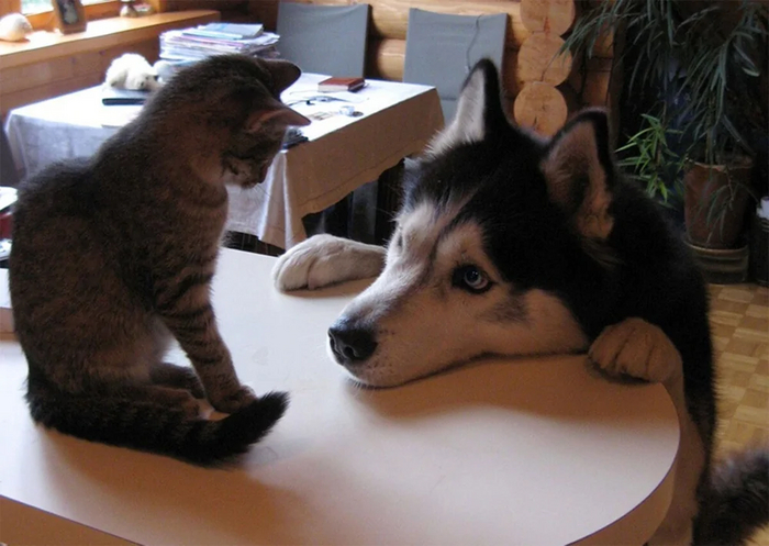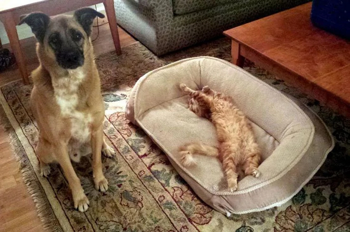 Они порой просто не знают как действовать, ибо им самим бы на ум не пришло, например, занять чужую лежанку или будку. И когда кошка без зазрения совести занимает собачье место отдыха, собака просто удивленно смотрит на это, и не знает что делать. Поэтому не делает ничего.