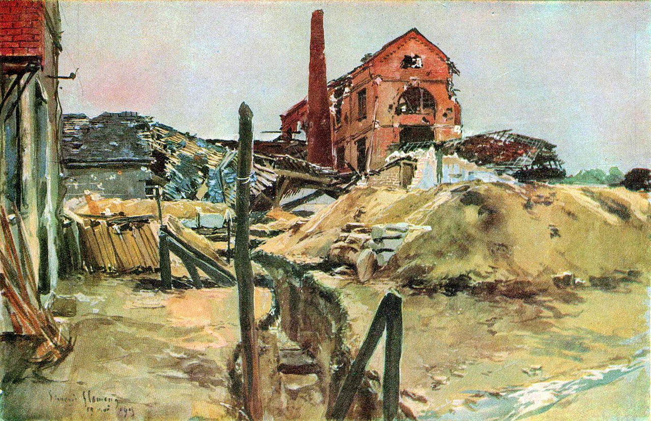 Из "бесспорно евойных" вроде вторая "руина фронтовая" ничего. Но недоработана (наверно чисто с натуры - что вижу, то пою), а надо было деревья характерно сломанные артогнем пририсовать (это и на фотографиях подчеркивали) - спереди справа на переднем плане (а не какую-то хрень непонятную на заднем - автор-то может быть и знал, что это такое там было, но зритель-то нет :-)).