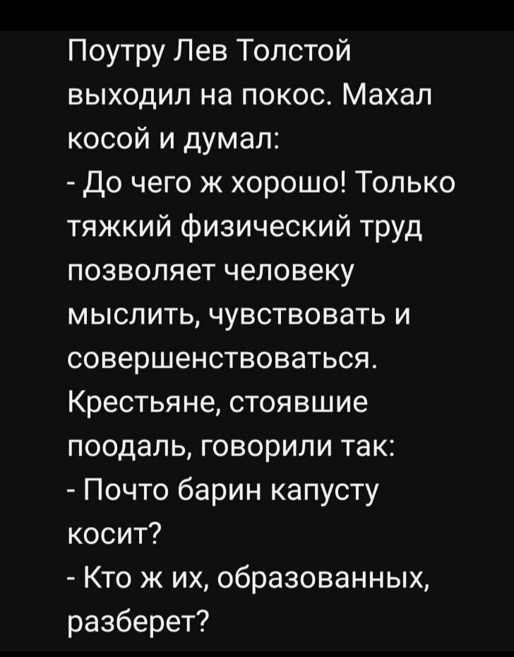 - Знаете, почему Лев Толстой пахал? - спросил я тогда тоном, который предполагал риторический вопрос. И тут же сам на этот вопрос и ответил: