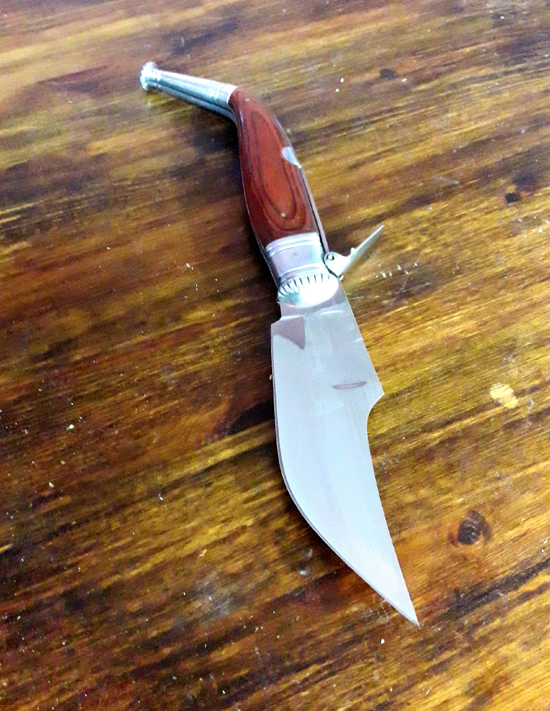 Теперь о рукояти. Ну во-первых, такая вот «пистолетная» форма рукоятки навахи-бандольеро способствует полному закрытию режущей кромки широкого лезвия, кончик острия которого «вздёрнут» вверх. Во-вторых, «пистолетная» форма задней части рукояти была удобна для изуверского проворота ножа в ране поверженного противника (вспомним некоторые современные отвёртки с Т-образной рукоятью). И, наконец, в-третьих, такая рукоять была удобна для удержания навахи, так как удлиняла её при тычковом фехтовальном ударе. В том числе и о таком способе удержания навахи упоминали тогда в своих трудах некоторые современники-фехтовальщики . В защиту столько кровавого имиджа этого складного национального испанского ножа можно лишь попытаться сказать, что наваха с одинаковым успехом могла использоваться как для бытовых нужд, так и для защиты от супостата. Ну или для нападения.