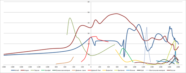 Итак, я взял население этих стран на протяжении последних четырех тысяч лет в процентном отношении к населению всего мира на тот момент времени, и получились графики. Туда же добавил крупнейшие по населению страны мира в истории для сравнения.
