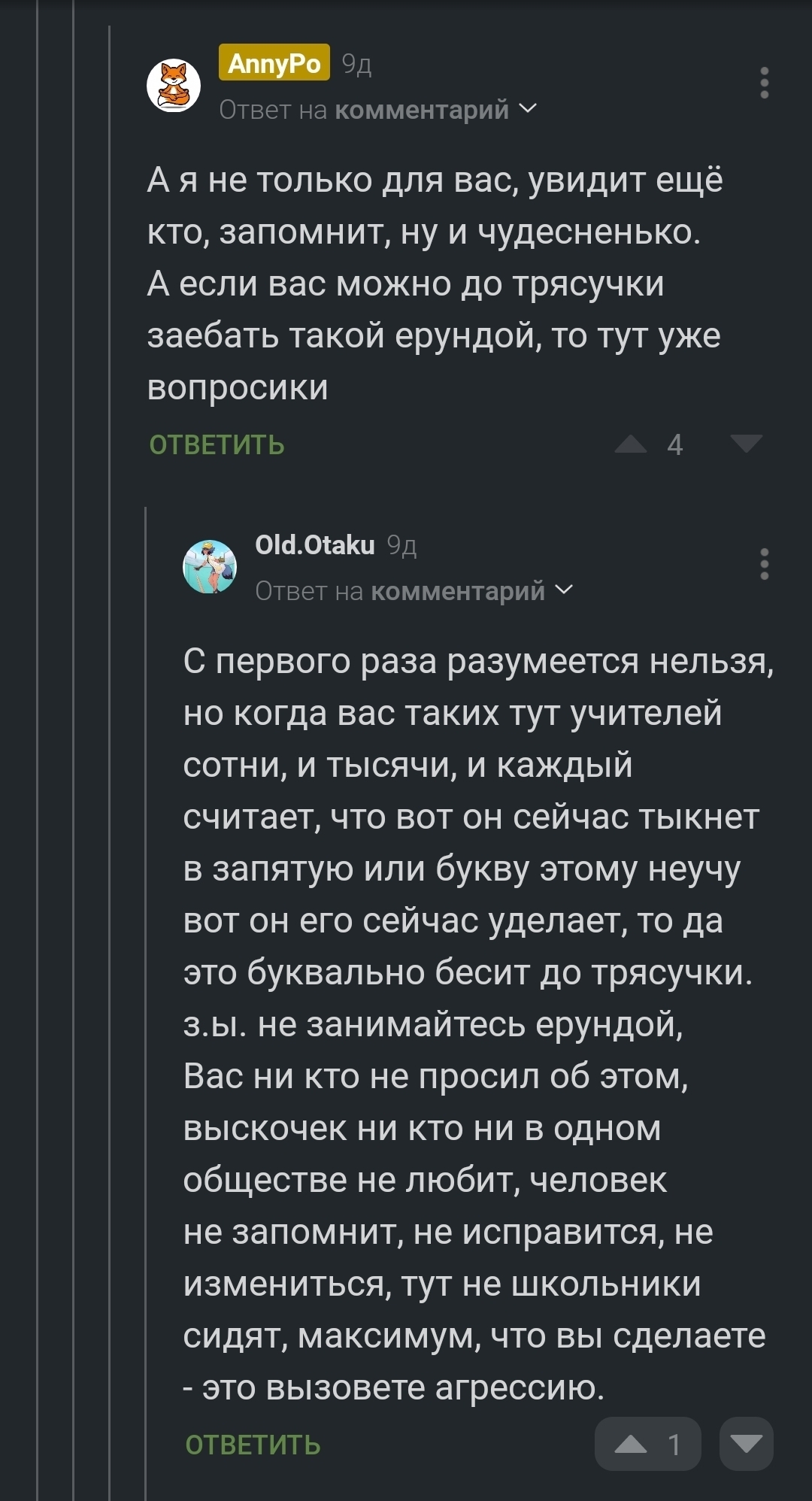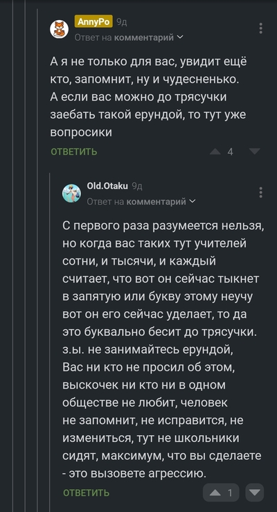 Если меня поправляют за грамматические ошибки, я всегда благодарю и исправляю пост. Если, конечно, поправили не в формате "Слышь пидор хуйли ошибка тут".