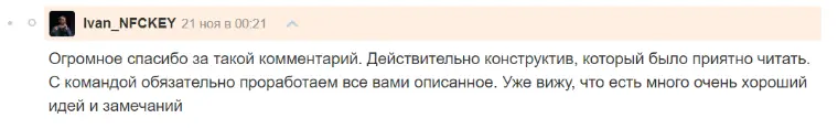 Опыт нашей команды: очень многое из комментариев взяли себе на карандаш, а большую часть из этого даже реализовали. Статьи, которые я пишу про NFCKEY, во многом нужны для того, чтобы видеть обратную связь от людей, перенимать ее и улучшать наш продукт. Это замечательная возможность, которую необходимо использовать для достижения успеха.