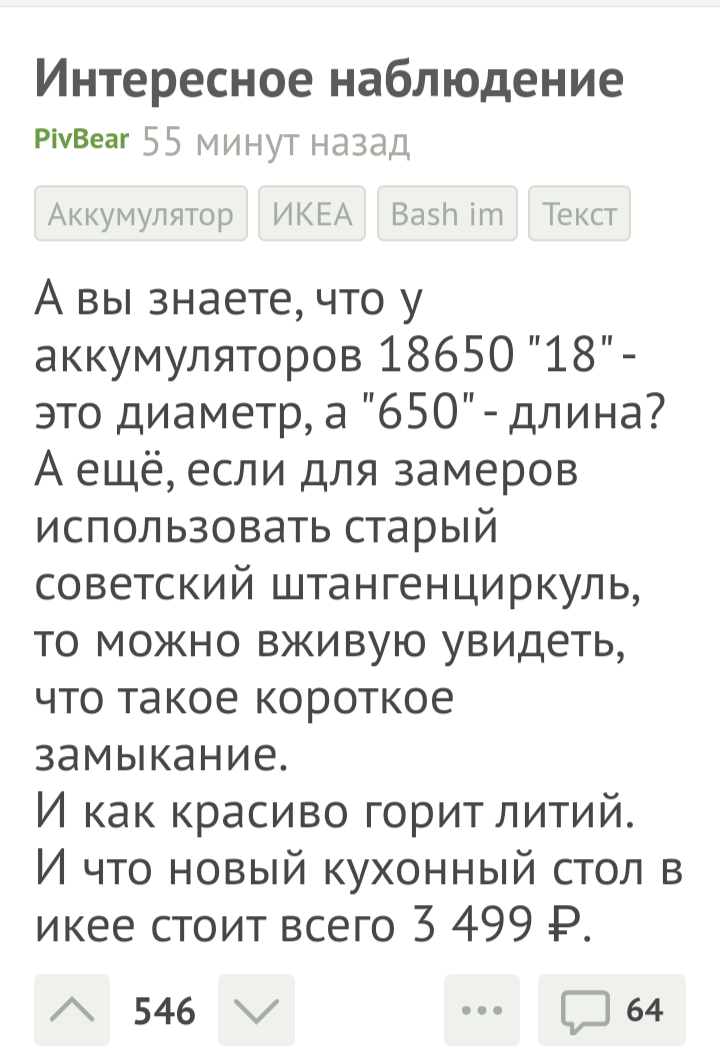 Купил недавно аккумулятор "18650" для нового фонарика и для начала решил его зарядить. Решил зарядить от зарядника от телефона (ведь там тоже литиево-ионный). На заряднике отрезал проводки и для надёжности припаял советским паяльником толстые провода. немного прогрел аккумулятор, но от тепла паяльника расплавилась оболочка на корпусе аккумулятора, но думаю кислота внутри не успела выкипеть. Зарядник обычный "5V 3A" поставил на ночь, а утром почуял запах гари! это он очень сильно нагрелся и начал прожигать стол. Я быстро его отключил и начал дуть, чтобы он остыл. Но через пару минут он начал шипеть! Я очень испугался, что он испортится или сейчас вытечет кислота из него, но тут он загорелся! Я побежал за водой и начал его тушить, но тут он от воды пыхнул и взорвался. Из аккумулятора вместо кислоты вылетел какой-то чёрный свёрток, который сильно горел! я решил его залить водой, но он начинает сильно шипеть и ещё больше гореть. От страха я начал его тушить молотком, но он только сильнее начинал гореть. Тогда я решил засыпать его песком, но он начал искрить и стрелять горящим песком по всей комнате. тогда мне пришлось его выкидывать в окно с помощью ложки, но пока нёс до окна он разлетелся в пепел и упал на ковёр. после этого он начал остывать...... Теперь я даже не знаю, что это было? Вместо обычной кислоты там был какой-то чёрный свёрток! может, это подделка?