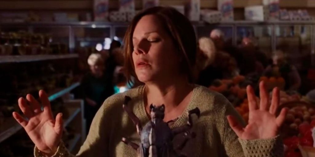 В фильме "Мгла" по Стивену Кингу есть фанатичка миссис Кармоди. В одном эпизоде на нее садится одна из небольших тварей-из-тумана...