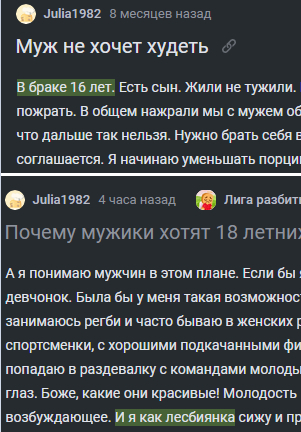 тут вы лесбиянка, в ответе на посте ребенок в 3 ем классе, еще более раннем посте муж не хочет худеть