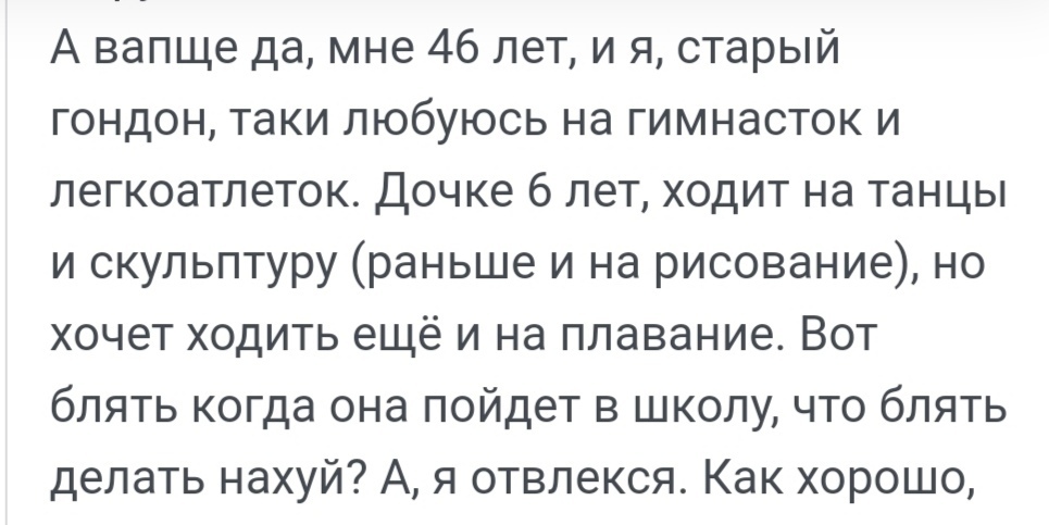 А вапще да, мне 46 лет, и я, старый гондон, таки любуюсь на гимнасток и легкоатлеток. Дочке 6 лет, ходит на танцы и скульптуру (раньше и на рисование), но хочет ходить ещё и на плавание. Вот блять когда она пойдет в школу, что блять делать нахуй? А, я отвлекся. Как хорошо, когда есть дочка, особенно если младшая. Пацан - он с рождения "должен". А доченька - спасибо, что есть)