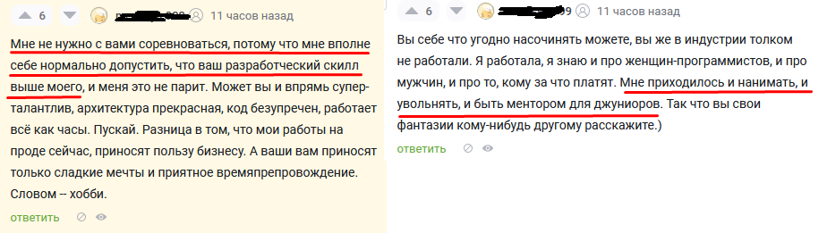 При этом я предлагаю вызов на дуэль и проверить у кого знаний больше в программировании по бекенду, фронтенду поставить определённую задачу на 2-3 часа и кто быстрее и лучше справится именно на практике, а не в теории(не исключаю что зазубрила основу только из за этого взяли+ баб берут просто так зачастую даже не докапываясь).Предлагал деньги если меня выиграет. Ведь лично для меня программирование хобби которым занимаюсь лет 10 и не получил ни копейки, по факту я даже не джун. Раз боится бросить вызов мне любителю фактически ламеру это ещё раз доказывает что баб програмистОК нет!