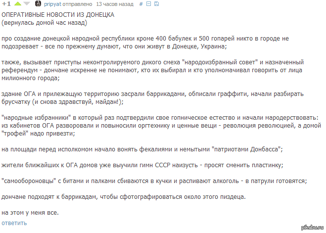 Gnoi Почему никто не слушает дончан ? 11 лет назад Рискую быть заминусованым, но разве можно верить только новостям ? Это единственный её коммент который не заминусовали. Донецк Украина Россия Самооборона Революция