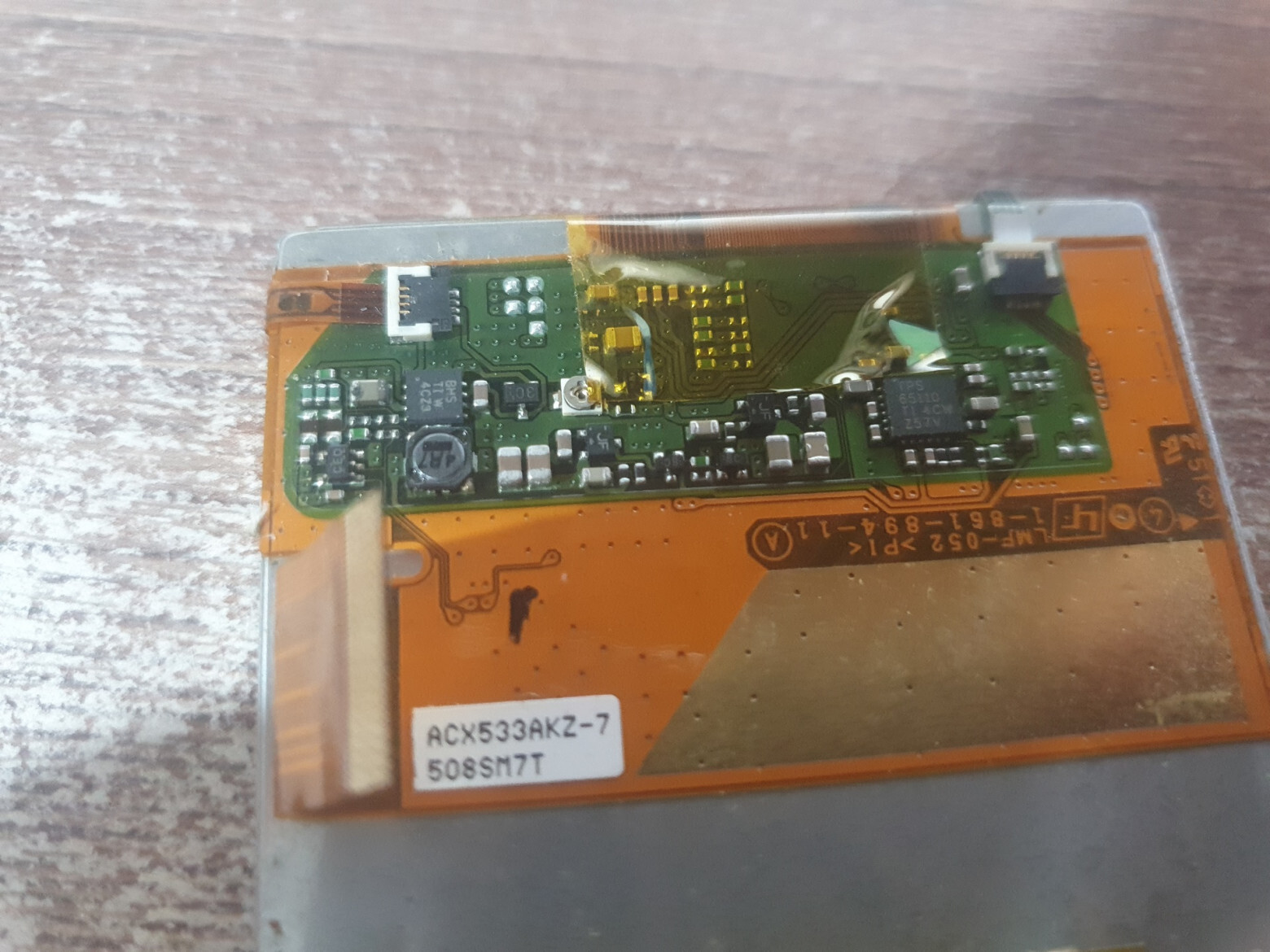 Около разъёма можно наблюдать ещё два «питальника» устройства: ШИМ-контроллер MAX1887, а также контроллер зарядки аккумулятора MAX1874E. Чуть ниже расположилась неизвестная микросхема, судя по характерной для Sony маркировке — это контроллер дисплея.