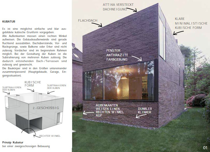 Наиболее важным пунктом концепта стала заложенная в нем типология зданий – кубичные дома в стила баухауса, без выступающих элементов – балконов, эркеров, с плоской крышей. Материал – типичный для северной Германии кирпич. На основе этого концепта, в дальнейшем, был составлен план застройки и сформулировано руководство по дизайну – нечто похожее на альбом типовых решений.