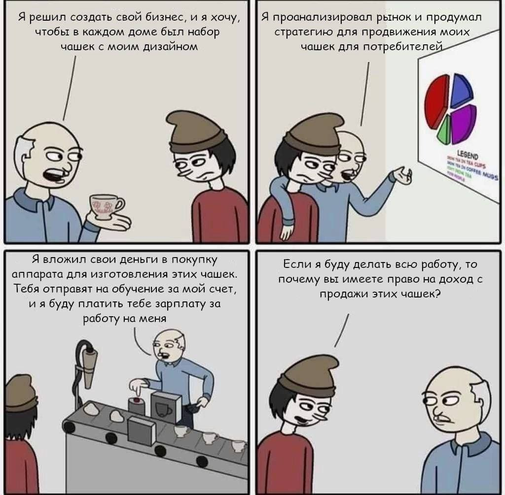 Предприниматель придумал идею, разработал бизнес-стратегию, вложил собственные средства в оборудование, взял на себя риски и обучил рабочего. Рабочий — мастер своего дела, он производит отличные фарфоровые кружки. Но всё это стало возможным именно потому, что предприниматель создал условия, в которых труд рабочего стал приносить реальную ценность. Это не про несправедливость — это про сотрудничество. Один думает, рискует, организует, другой — создает руками. Без рабочего кружек бы не было. Но и без предпринимателя — тоже. Коммунистическая идея делить всё "поровну" игнорирует важную часть: вклад в организацию, управление и риск. Она предлагает всем одинаковое вознаграждение, независимо от характера и уровня вклада. В долгосрочной перспективе это убивает мотивацию, сдерживает развитие и делает всех беднее. Создавать, вкладываться и рисковать — это тоже труд. И он тоже должен быть вознаграждён