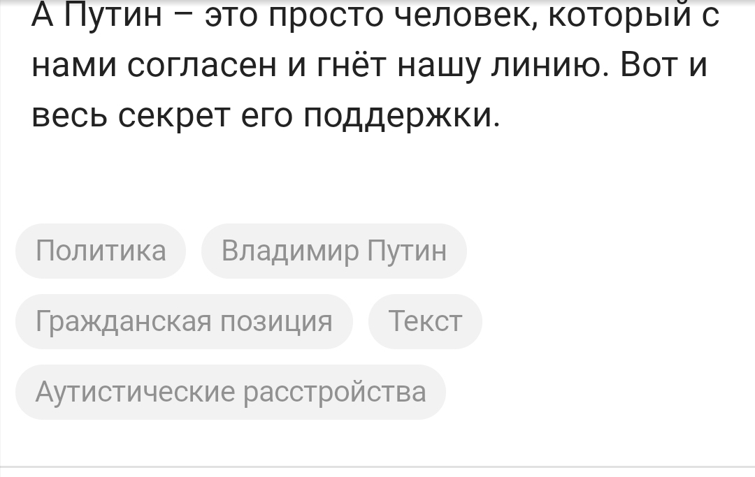А Путин – это просто человек, который с нами согласен и гнёт нашу линию. Вот и весь секрет его поддержки.