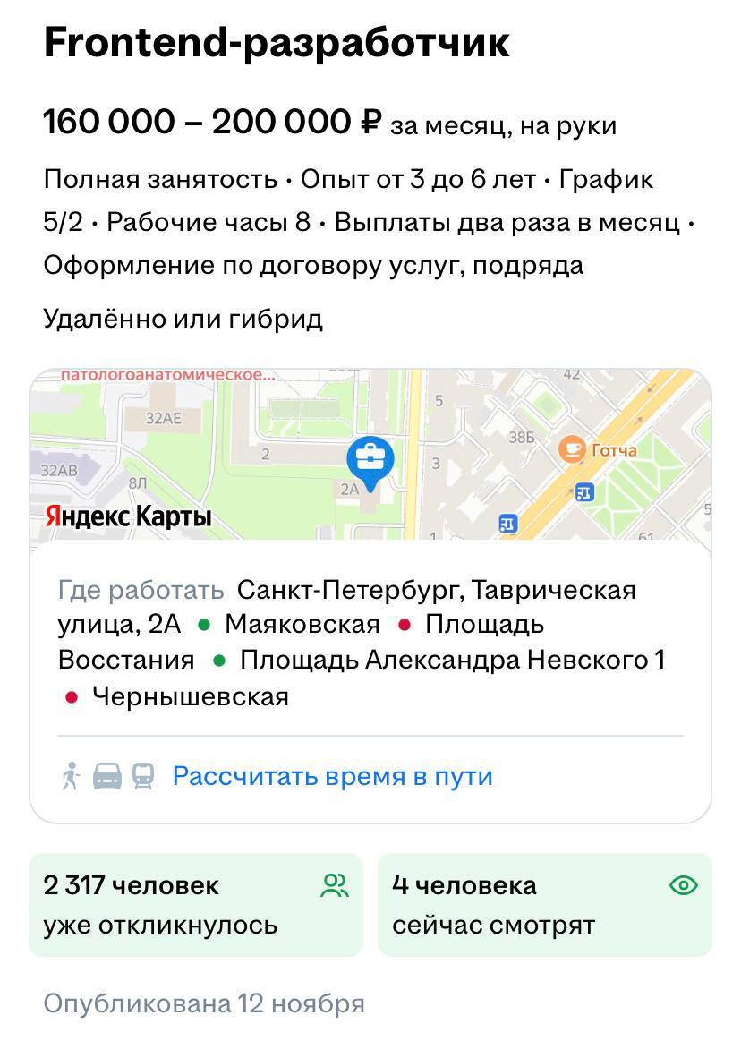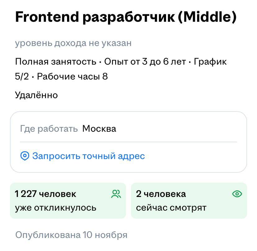 Я фронтенд-разработчик с опытом около 3 лет. Уже месяц ищу работу, откликаюсь каждый день - и я просто в ярости. Картина на hh.ru везде одинаковая: под любой вакансией уровня middle или даже junior-middle - 1000-2000 откликов.
