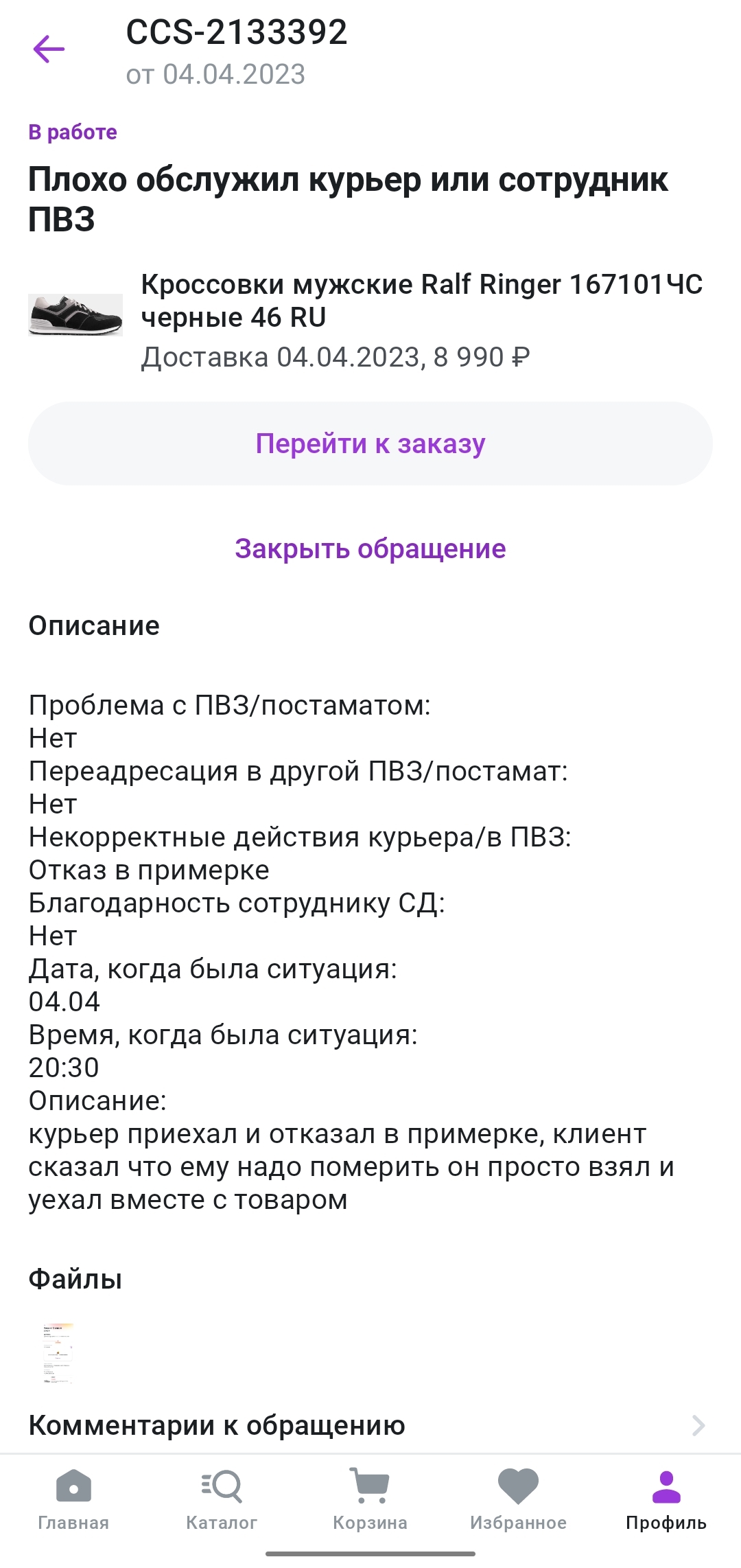 С телефона жены сообщаю свой номер заказа и дальше диалог идёт по нему, создают обращение с жалобой на курьера, вижу отображение жалобы в личном кабинете, ок, на след день проснувшись вижу вот такое сообщение