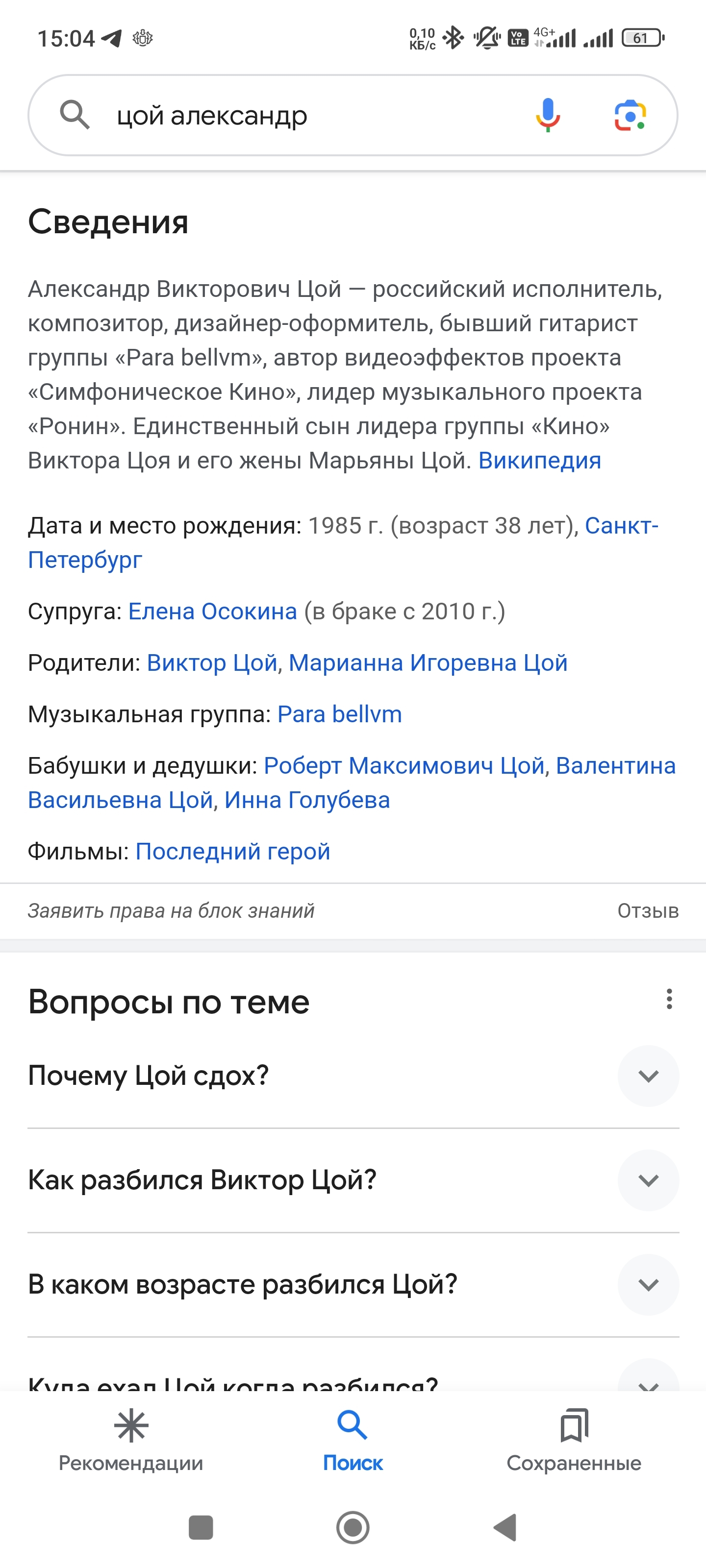 Гуглил в телефоне "Цой Александр". Нет фанат, от того не знал, что у него сын есть и вот решил узнать кто такой и т.д.