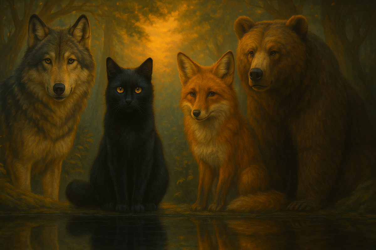 Проекции древних духов — ведь раньше верили, что душа леса может заговорить через волка, медведя или птицу.