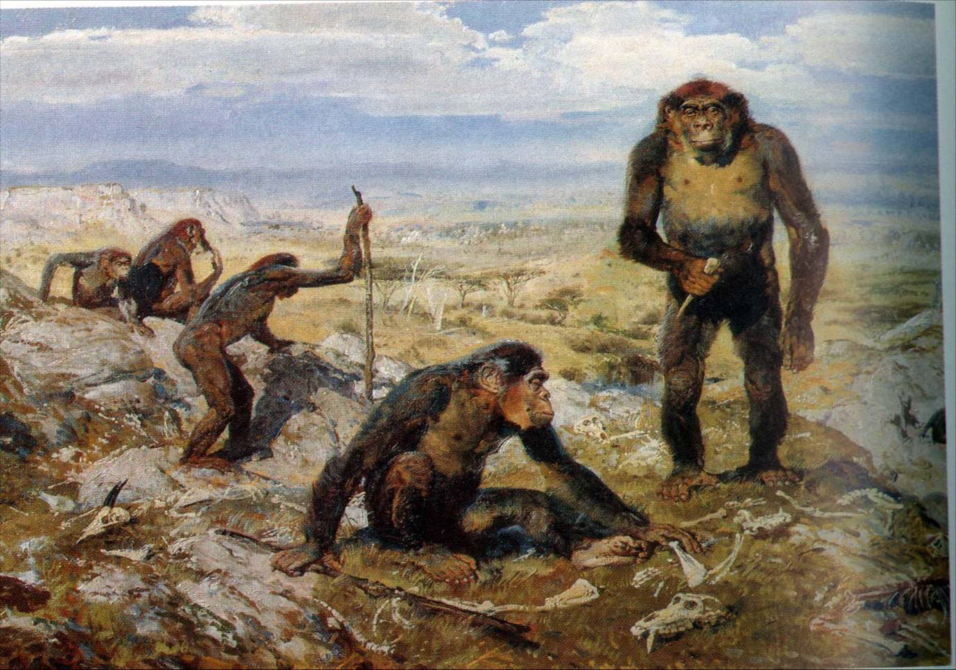 Не знаю, сознательно или нет художник изобразил гоминидов рядом с останками павиана, но символизм картинки просто зашкаливает. Ведь именно павианы были теми, с кем наши предки жёстко конкурировали.