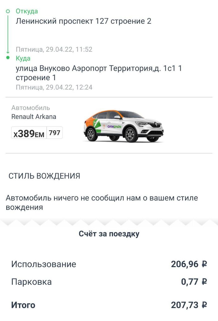 Ну и вот для примера недавняя поездка на СитиДрайве. Даже бОльшее время в пути (от метро Тропарево). Таких поездок я сделал на днях три подряд и все они были в адекватную стоимость.