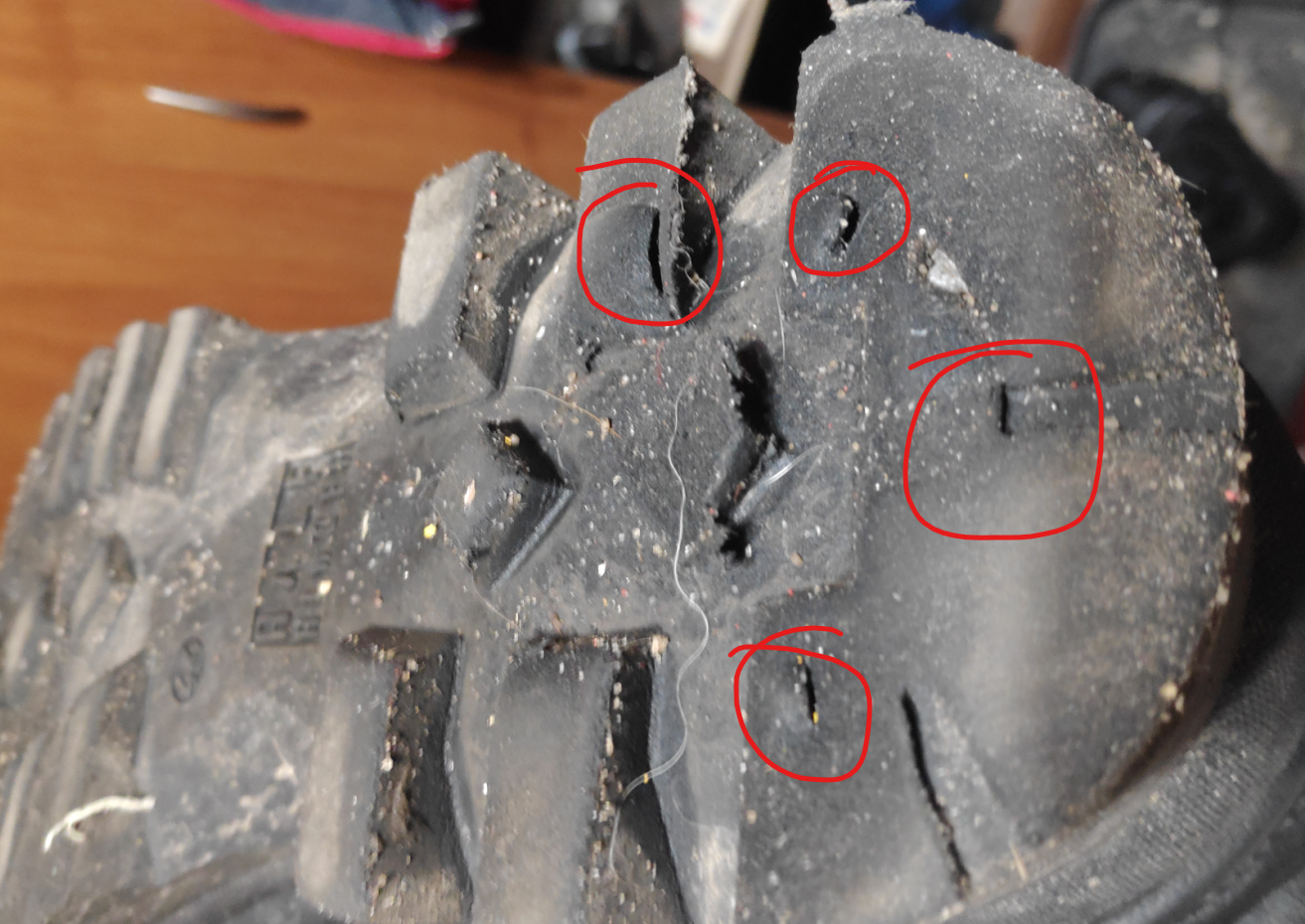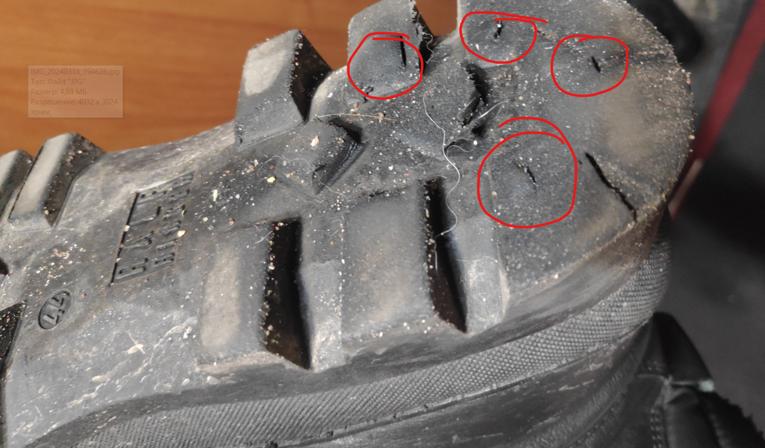 Тупо стерлись. Где выделил красным, там сквозные дырки внутрь подошвы.