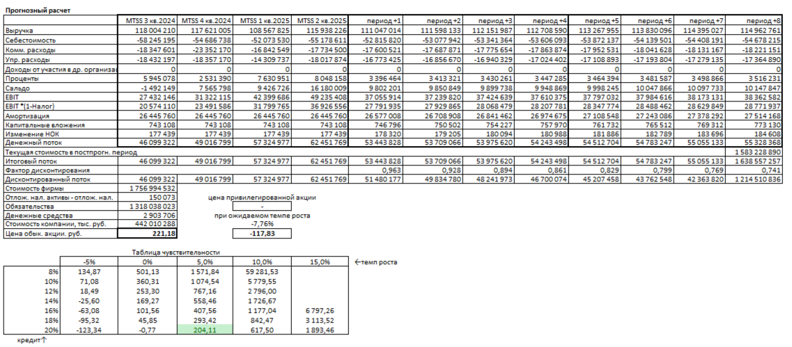 Рассчитанная WACC составила 16,15%, что существенно ниже среднего по отрасли (19,61%). Более низкая «цена капитала» положительно влияет на итоговую оценку стоимости компании, так как означает, что инвесторы требуют меньшую доходность за вложения в этот бизнес из-за воспринимаемых низких рисков.