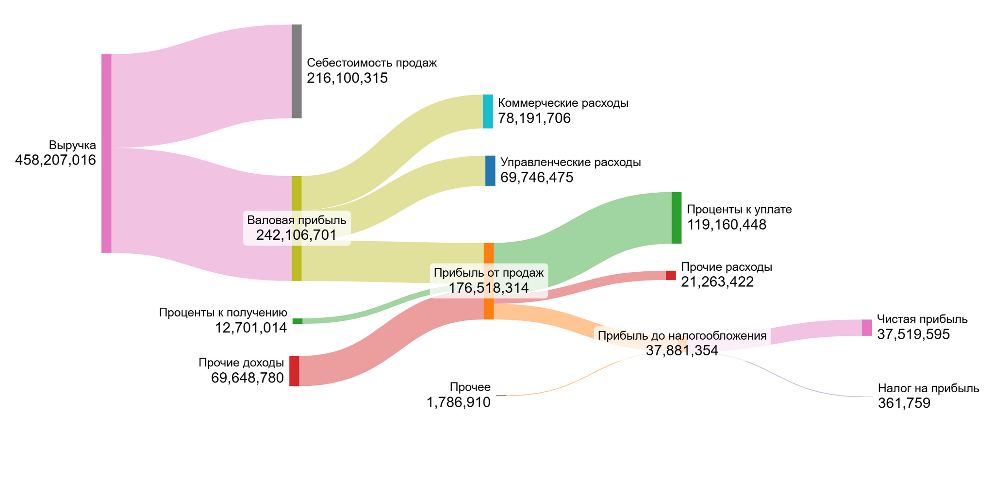 Сравнение с отраслевыми показателями раскрывает интересные детали. Доля себестоимости у компании составляет -47,56%, что значительно лучше отраслевого среднего в -73,83%.