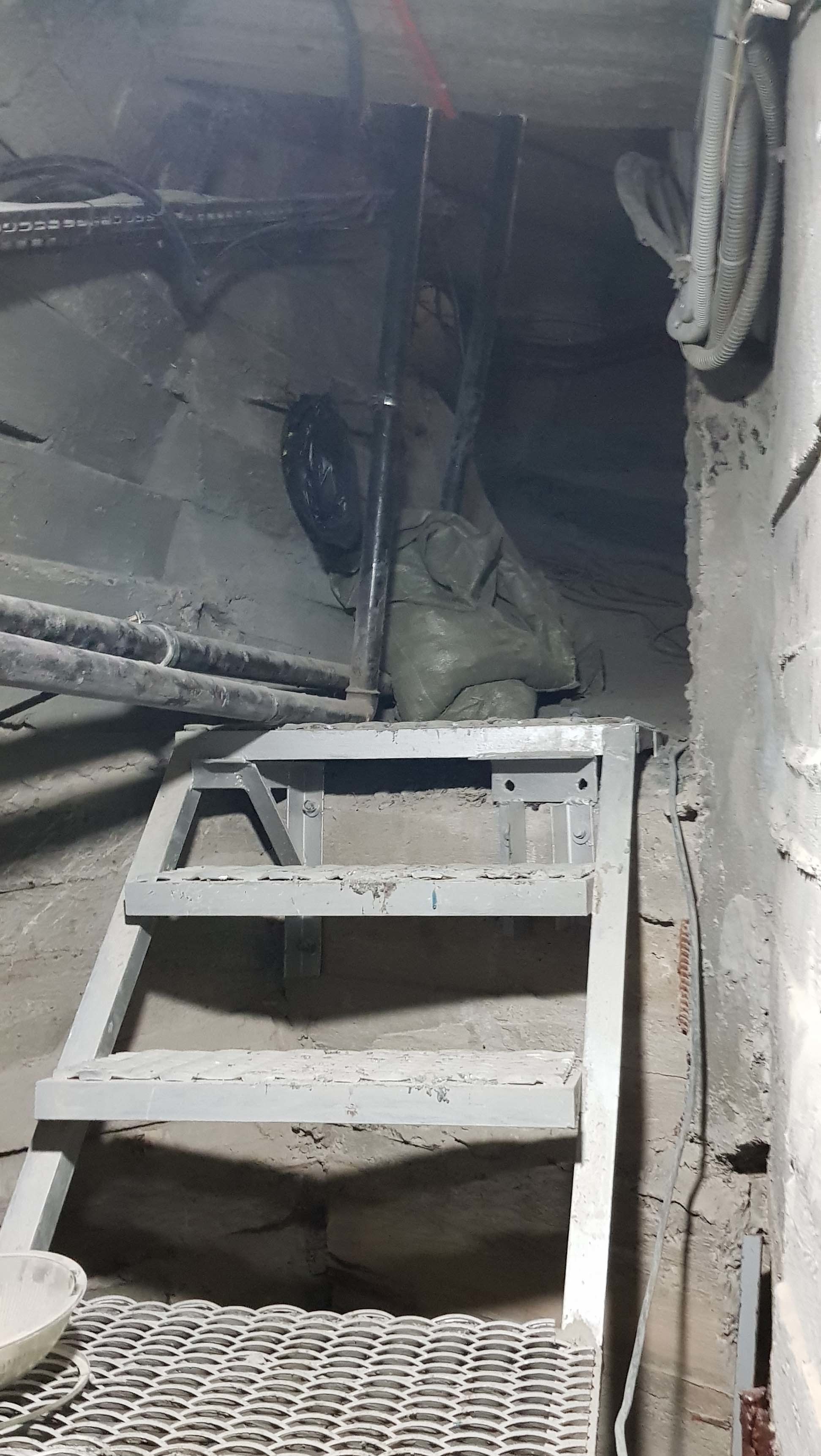 Из плеч, в голову, через шею ведет узкий лаз по металлической лестнице.