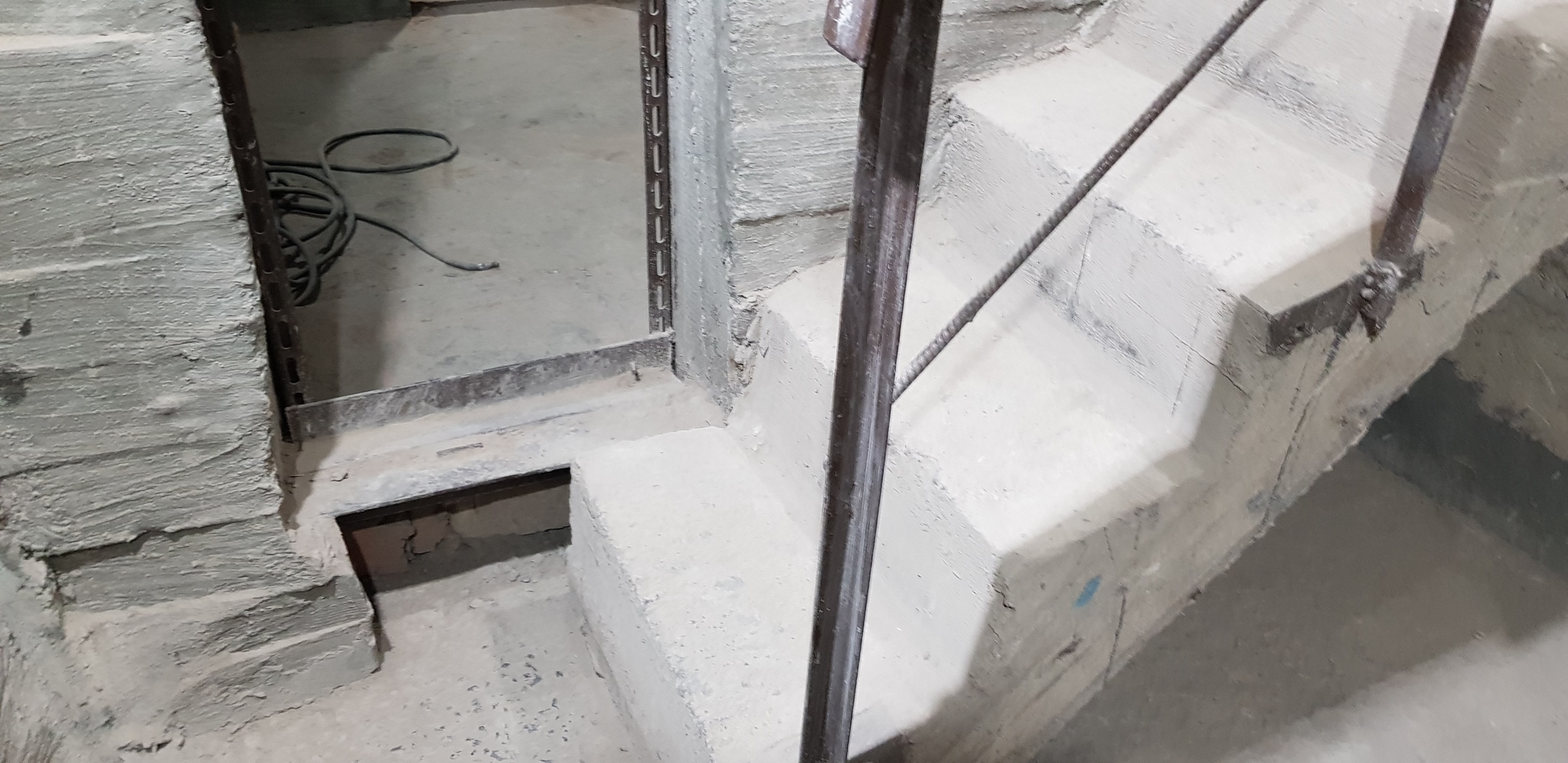 Лестница находится в районе левой ноги. Обычная крутая бетонная лестница с металлическими перилами.