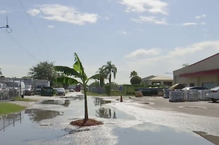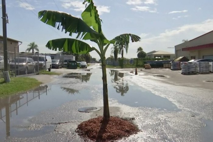 У человека, которому надоела частная дорога в плохом состоянии рядом с его бизнесом на юго-западе Флориды, появилось новое решение: посадить банановое дерево в выбоине, чтобы предупредить автомобилистов.