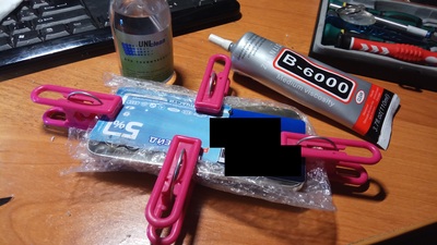 Соответственно, берем новый модуль, вычищаем внутрянку, клеим сперва модуль, держим на прищепках часа 2.