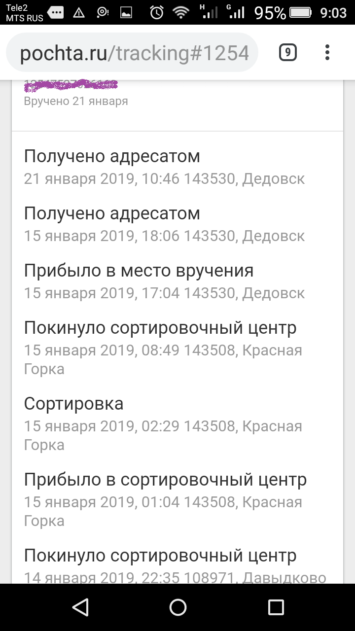 2. Я купила на сайте объявлений коллекционные наклейки. Попросила выслать их заказным письмом по адресу своей мамы. Письмо быстро дошло. Так быстро, что оказалось уже получено кем-то другим через час после прибытия в отделение. Мама сказала, что не забирала. На горячей линии Почты посоветовали пойти в отделение и разобраться. Там ответили, что уже вручено. После убедительной просьбы доказать документально тетенька стала рыться во всех коробках, письмо было найдено и вручено второй раз.