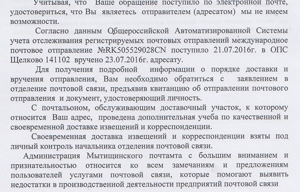Но не долго счастье длилось. Почтальонше видимо было абсолютно плевать на выговоры, она все так же не приносила извещения вовремя. На печатных извещениях (которые распечатываются прямо из системы) она просто замазывала настоящую дату ЗАМАЗКОЙ и ручкой писала рандомную, часто такую, по которой выходило, что я уже две-три недели не прихожу за отправлением (хотя если смотреть по базе - в этих числах оно находилось на какой-нибудь таможне). Уж не знаю, хотели ли с меня выудить денег за хранение или нет, но факт остается фактом. Я сфотографировала эти извещения и снова написала на сайт ПР о том, что мой почтальон занимается подделкой форм, утвержденных организацией ПР. И что я получила? Опять точно такую же отписку о взятом на особый контроль адресе и блаблабла. Друзья, как настоять на увольнении такого почтальона? Женщина получает деньги ни за что, просто не выполняя свою работу.