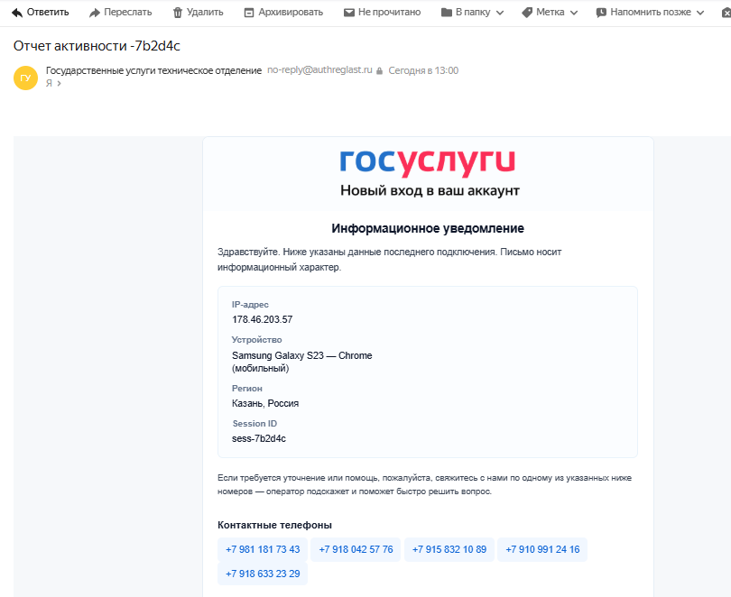 Всё бывает первых раз. Вот и мне сегодня "посчастливилось". Сначала напрягся, но обратил внимание на адрес, посмотрел как выглядит настоящее уведомление о входе и понял, что это вряд ли письмо от Госуслуг. Здравый смысл подсказывает - звонить туда так-себе затея.