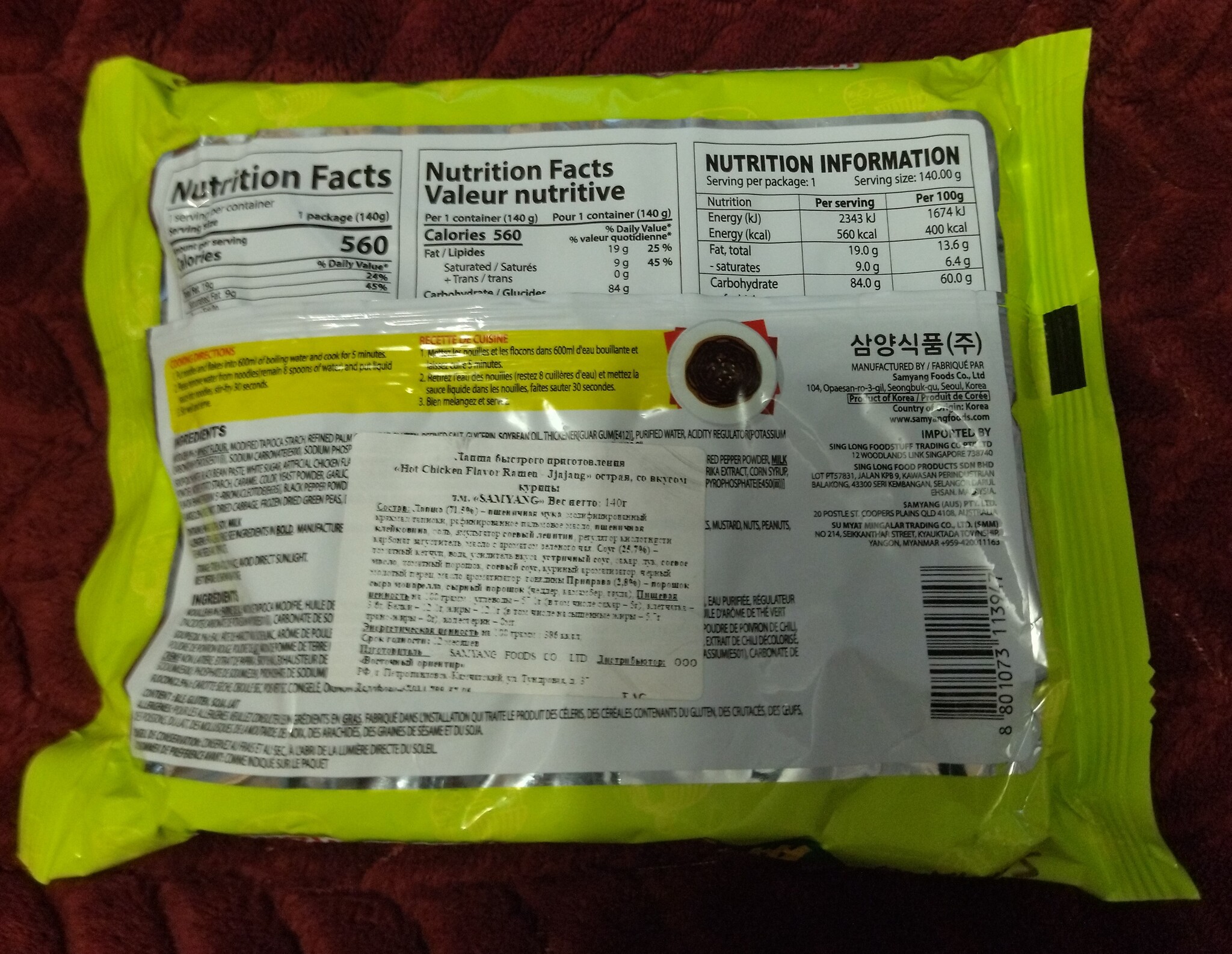 Эта лапша очень каллорийна и не очень остра. Острота-1920 сковиллей. Почти в 2 раза острее острого роллтона с курицей. Способ приготовления классический для самьянга:сварить лапшу, слить воду, потушить с соусом, но тут нету кунжута с нори, вместо него-сушеные овощи и кусочки соев. мяса, которые надо положить вместе с лапшой, а не украсить приготовленную лапшу.