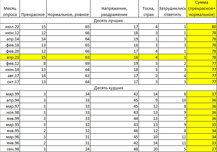 Там же прилагается и огромная таблица замеров по данному опросу. А он проводится, ни много ни мало, с весны 1993 года. Ровно 30 лет. С тех пор опрос проводился 183 раза. Счетовод перенёс все результаты в Excel и отсортировал по сумме положительных вариантов (прекрасное настроение+ нормальное, ровное). Оставив только по десятке худших и лучших.
