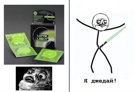 Лежим в обнимку у меня дома, смотрим фильм. Тут романтическая сцена, герои на экране целуются, мы следуем их примеру, в общем процесс пошёл. В момент, когда из одежды на нас остаётся только нижнее бельё я резко вскакиваю под предлогом "срочно надо отлить". И без палева утаскиваю с собой одно из резиновых изделий, подаренных добрым другом. В коридоре скидываю с себя труселя, распечатываю презерватив и натягиваю на свой "инструмент"(кстати светился он каким-то ядовито-зелёным цветом). Рывком открываю дверь в комнату и предстаю во всей красе перед своей любимой...3 секунды ступора, потом её истошный вопль "ВОЗЬМИ МЕНЯ О ВЕЛИКИЙ ДЖЕДАЙ!!" и мы оба падаем в приступах гомерического хохота))