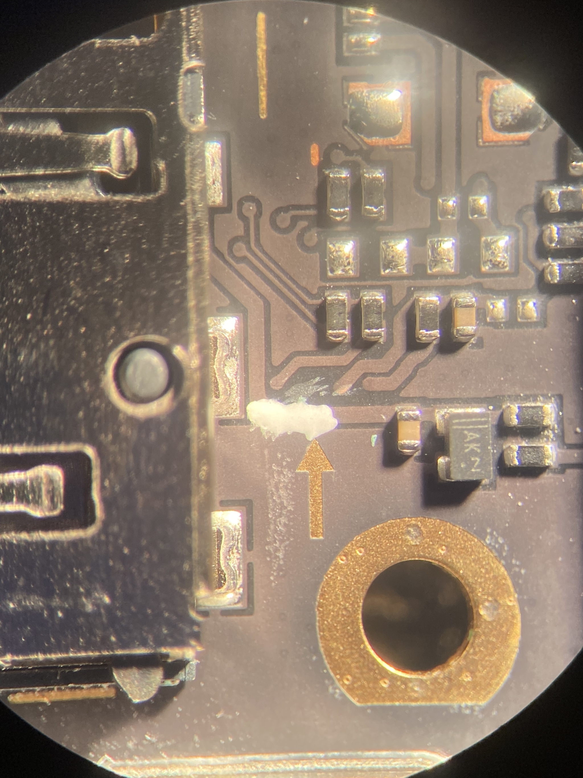 Эта толстая дорожка является той самой SIM_DETECT, и она каким-то образом немного покоцана, есть два оголенных участка дорожки. А чем повреждена-то? Смотрим в корпус телефона: