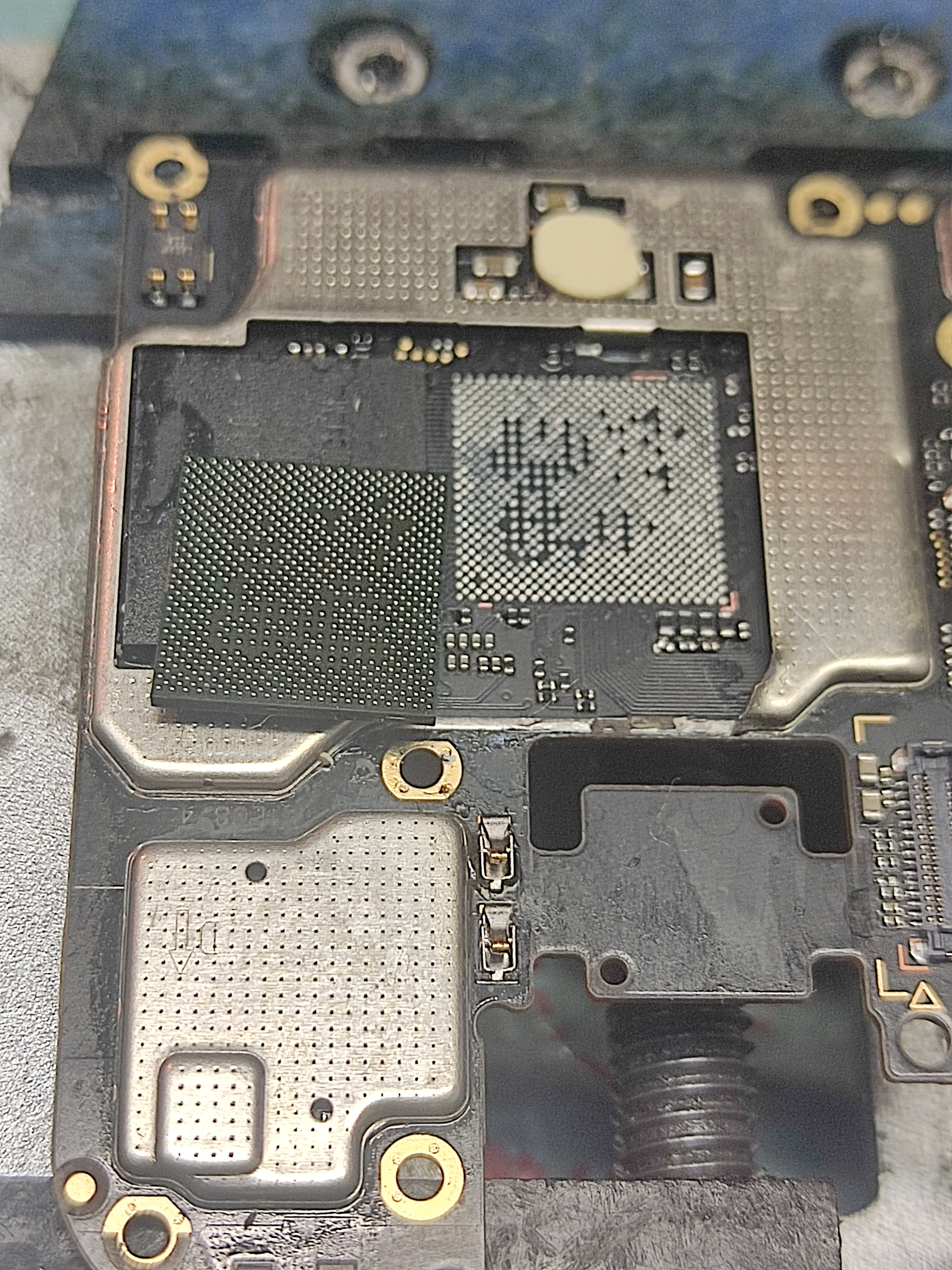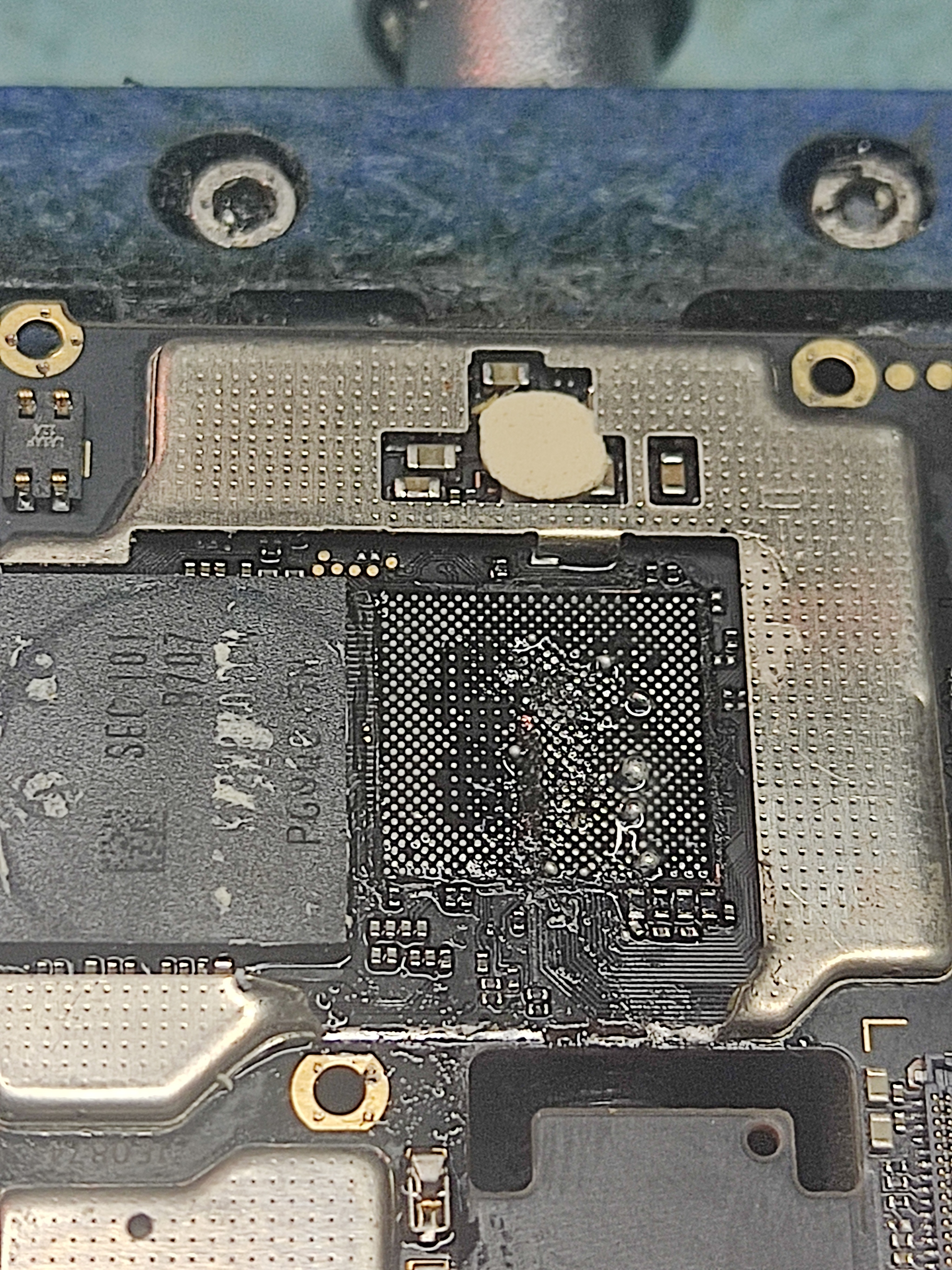 Аккуратно зачищаю компаунд по периметру , а микросхему UFS на 128 Гб которая стоит впритык к процессору локализую от нагрева .
