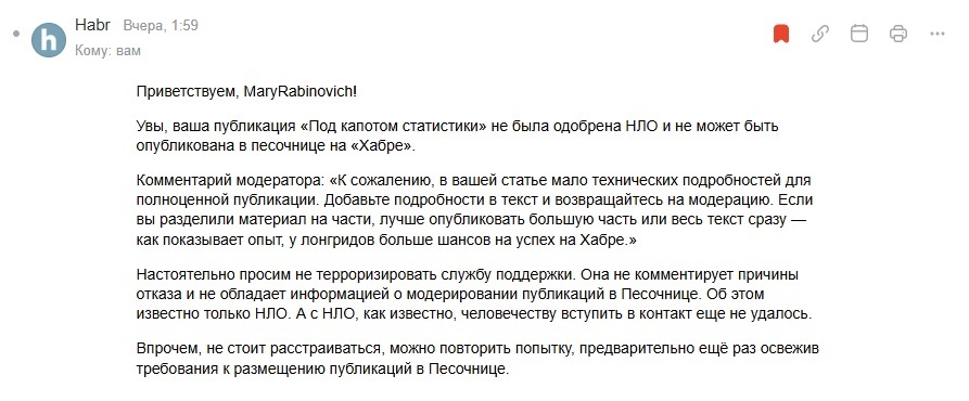 Чтобы не быть голословной - это скрин мейла с Хабра. Очень хочется попросить модераторов не модерировать ничего (даже не открывать) в два часа ночи после НГ или 2-3 января. Пейте, гуляйте, спите, потом модерируйте. Утро вечера мудренее, а пятое лучше третьего. А десятое пятого.