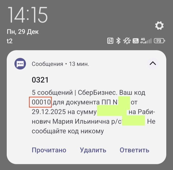 Во-вторых, я на Хабре написала под Новый Год (не шибко проработанную - тут они правы) статейку "Под капотом статистики" про вот это всё, и сразу после отправки на модерацию (я там отхабренная - как я считаю, беспочвенно, но что поделаешь. Главное, что отхабренные не от себя публикуют, а должны проходить модерацию) получила такой вот код от СберБизнеса. Это мой собственный перевод мне на карточку физлица с моего счёта ИП.