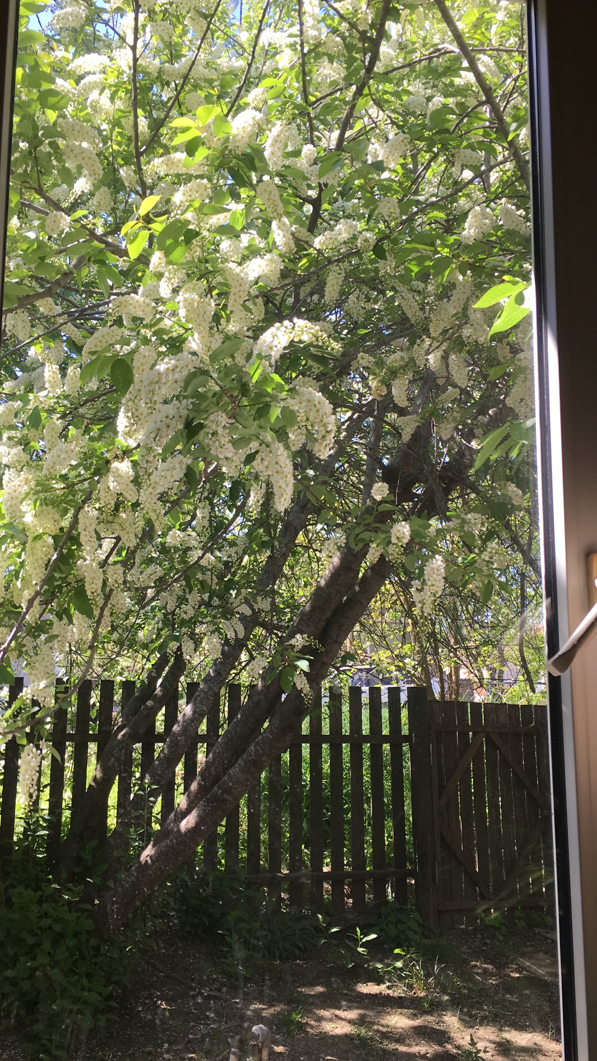 Фотография сделана прямо из кухонного окна, извините, если чё. Последний сильный дождь сбил с черёмухи остатки пышного убранства. И у нас третий день настоящее лето.