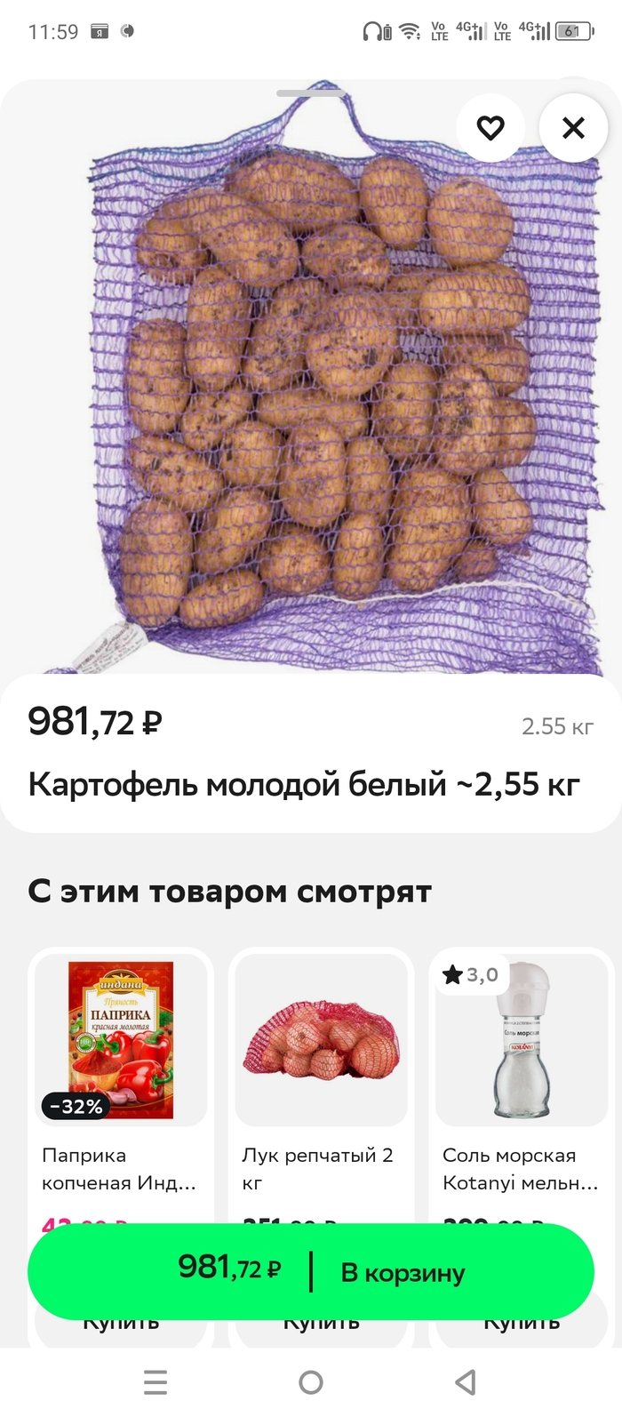 Картошечка, авоська 2,5 кг за 981 рубль) Здорово! Посчитал на пикабушной проге, сколько в кг: